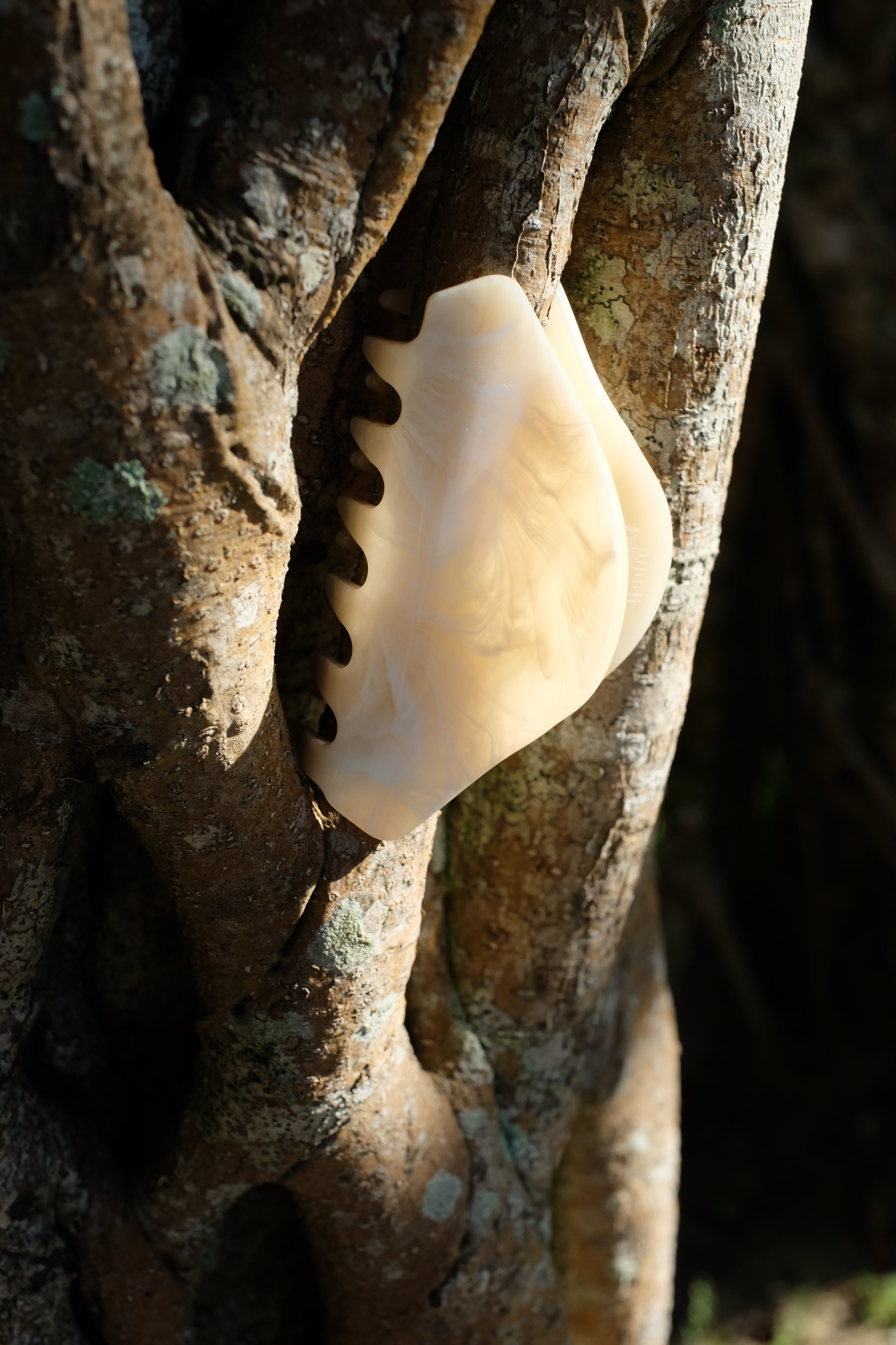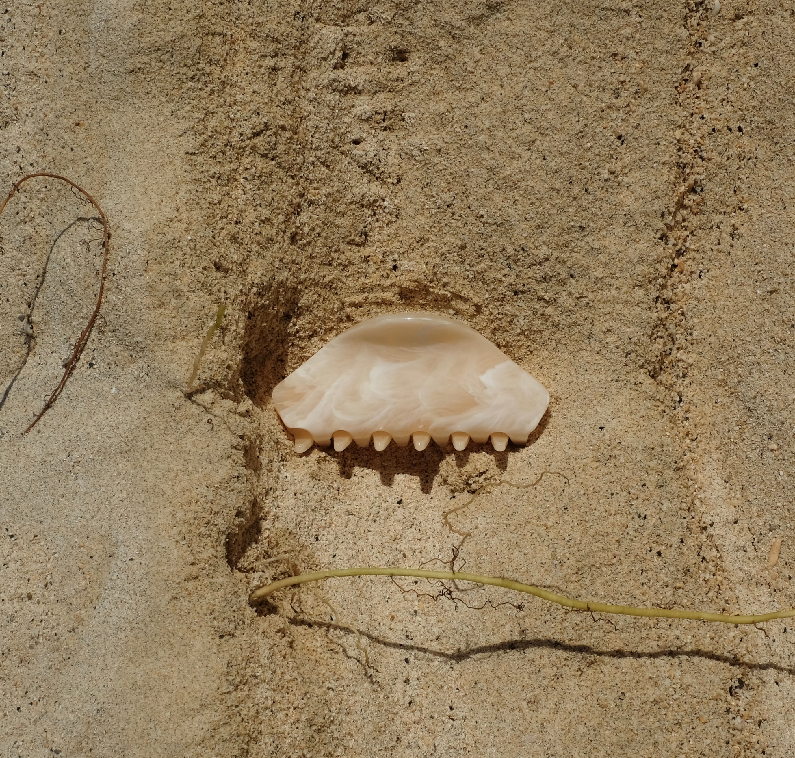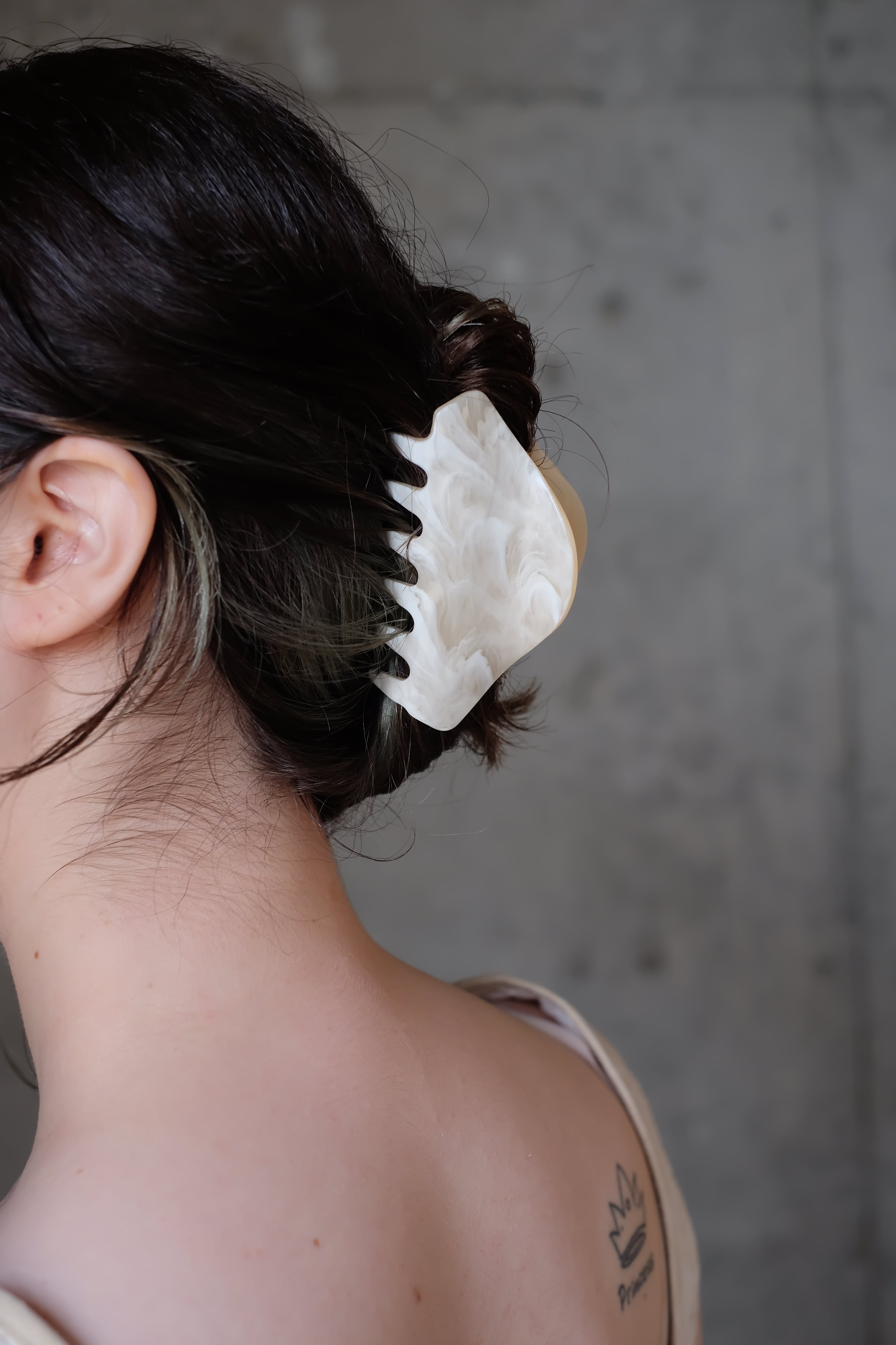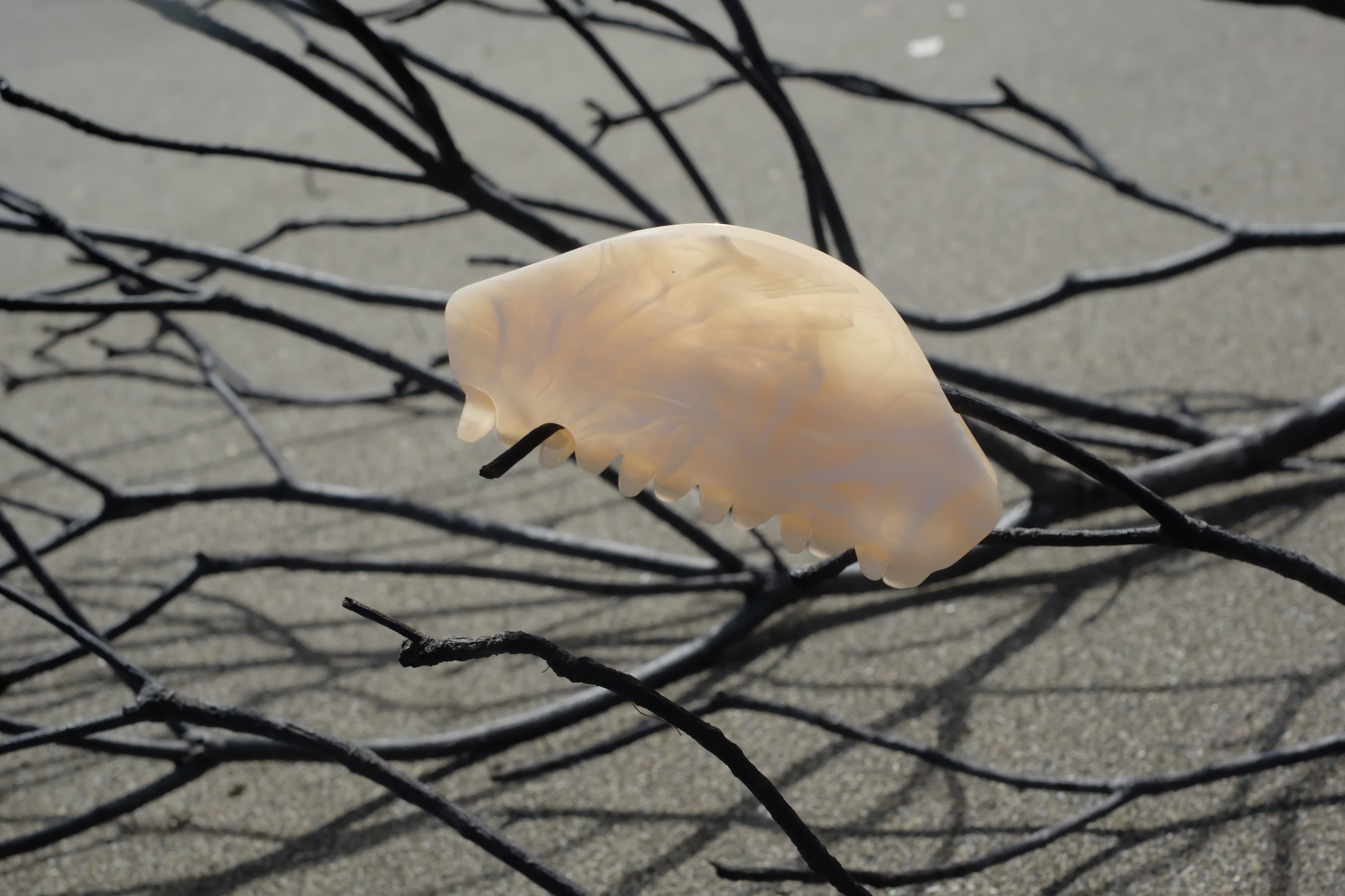 ⚫︎ベージュベースに白のマーブリングが美しい色味です。染色から加工まで日本の職人さん手作りしています。大きな板から型抜きして製作しています。その為1つ1つ色味の出方が少し異なります。そこがまたこのヘアークリップの魅力でもあります。